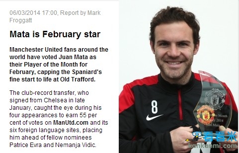 马塔被评为曼联2月最佳球员 过半票数力压维迪奇埃弗拉