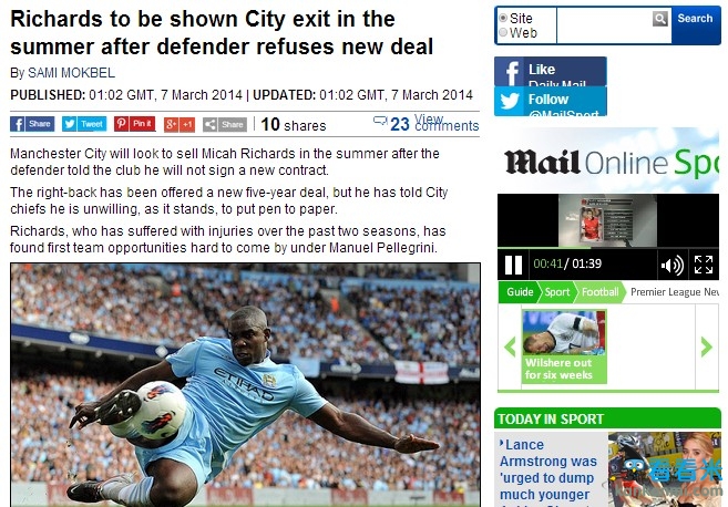 理查兹不受重用拒绝与曼城续约 今夏恐被蓝月亮抛售