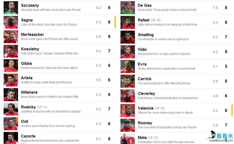 阿森纳0-0曼联赛后评分:斯泽斯尼全场最佳 马塔不及格