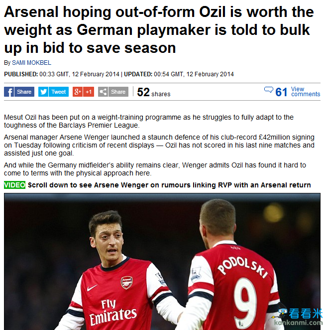 温格直言厄齐尔还需加强身体对抗 他该多射门别总传球