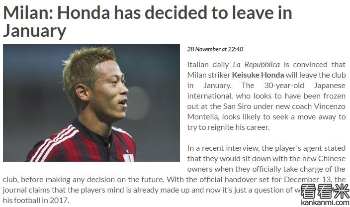 意媒:本田已决定1月离开米兰 中超或是新去处