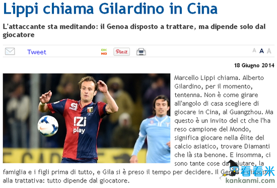 恒大或无缘意大利前锋吉拉迪诺 里皮再致电劝说