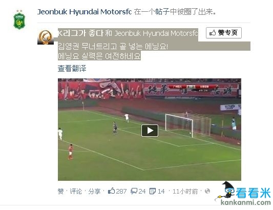 全北官方晒埃尼奥击溃恒大进球 韩球迷吐槽金英权