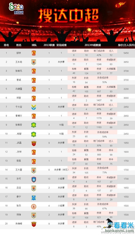中国球员身价排行榜:郜林5450万居首位 前十恒大占6人