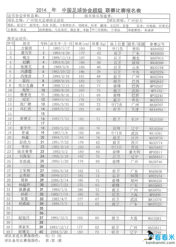 恒大公布34人中超名单 为刘健预留号码下放李健滨