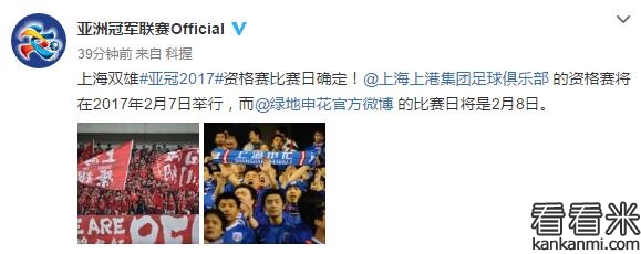 上港明年2月7号开始亚冠资格赛 申花8号