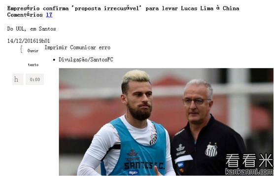 巴媒:经纪人确认利马将加盟中超 年薪超奥斯卡