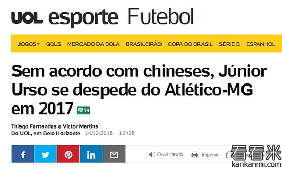巴媒:米内罗竞技与乌索谈判破裂 或重返中超