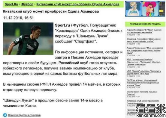 俄媒:乌兹别克队长或将加盟山东鲁能