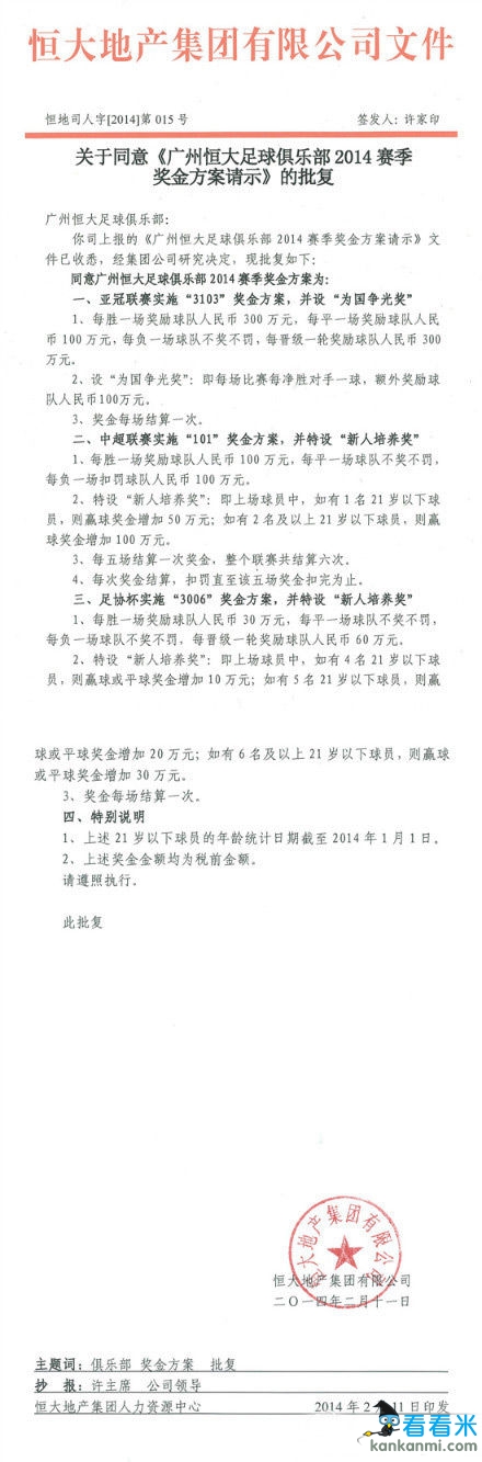恒大2014奖金方案缩水 亚冠赢球300万中超100万