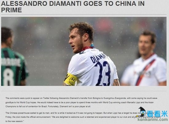 外媒:迪亚曼蒂起点比孔卡高 加盟中超对亚洲意义非凡
