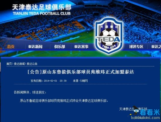 天津泰达官方宣布鲁能边卫加盟